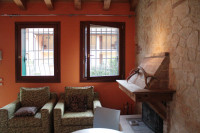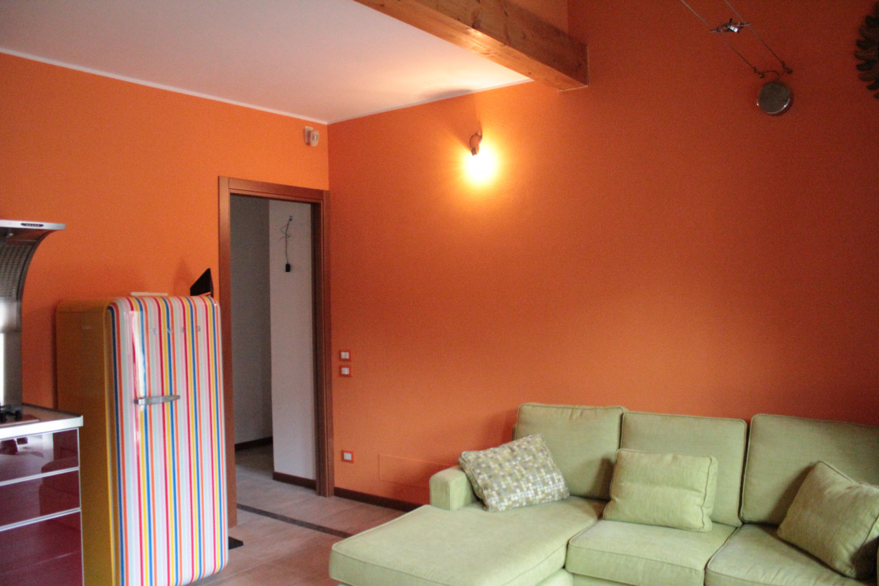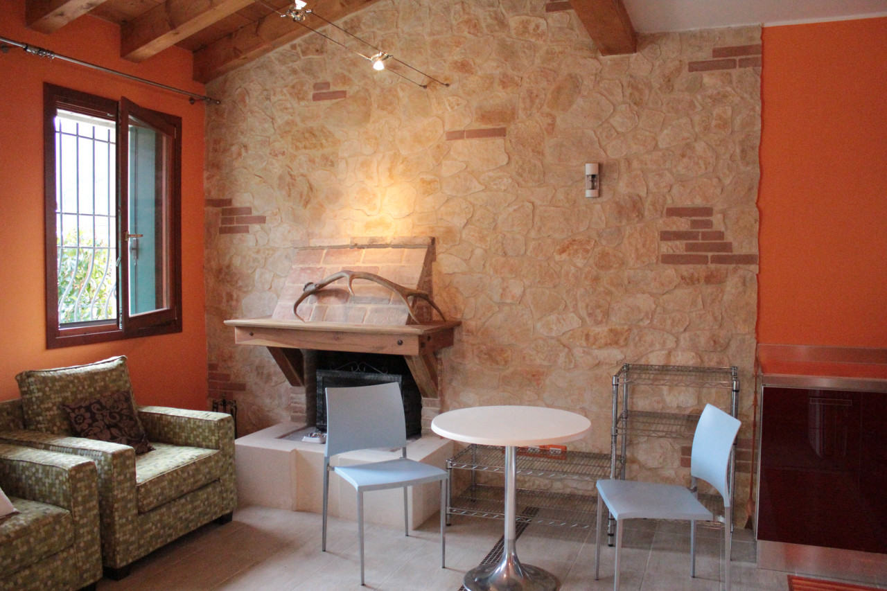 L'appartamento si presenta con uno spazio luminoso e ben distribuito, composto da una camera da letto spaziosa che offre accesso diretto ad una loggia. Il soggiorno presenta travi a vista, una parete in pietra e caminetto.